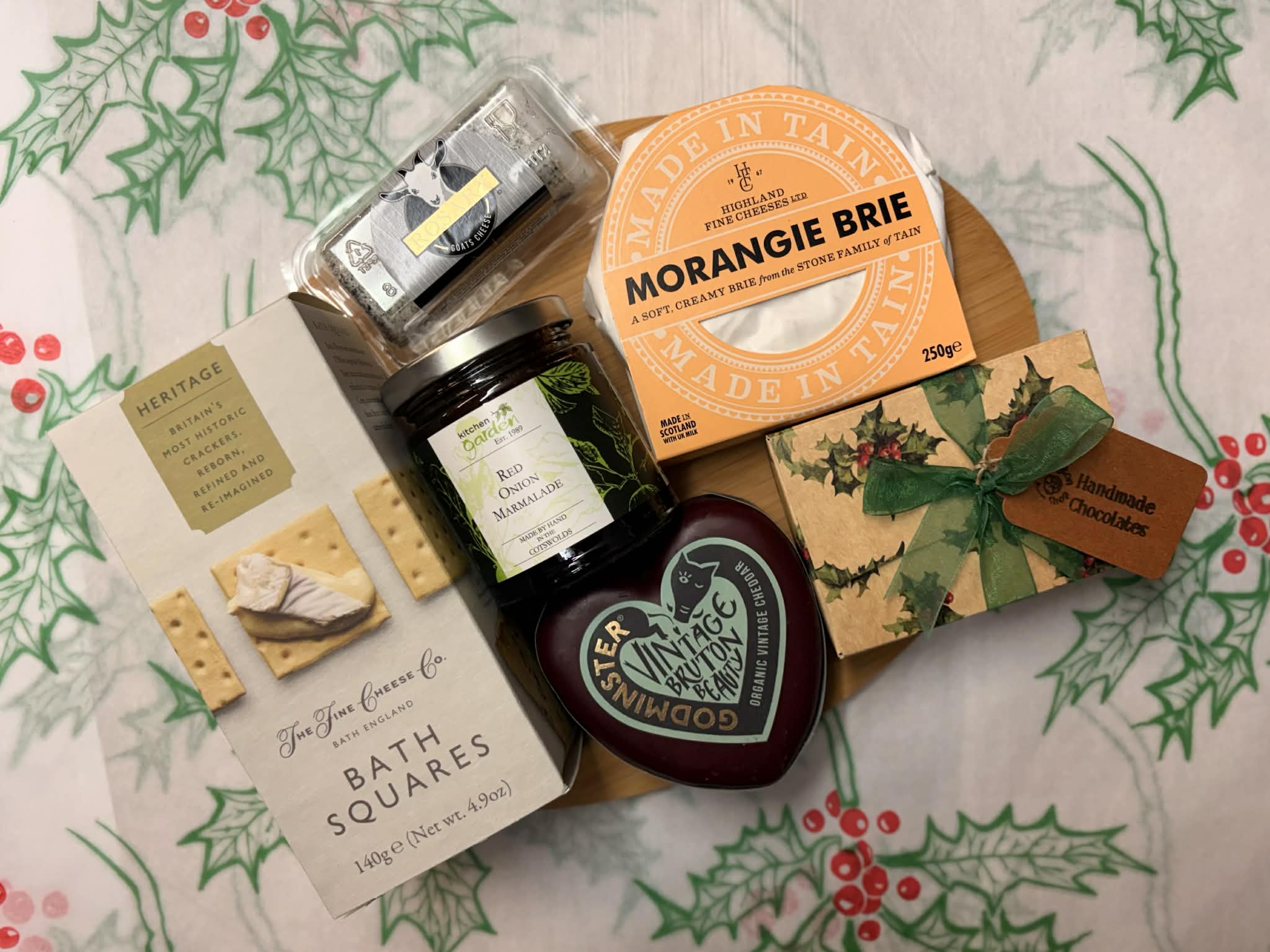 All presented on a wicker cheeseboard with red ribbon and a greeting card for your message. What will you find included in the hamper…?